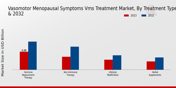 The Vasomotor Menopausal Symptoms (VMS) Treatment Market exhibits a strong market presence, primarily categorized under the Treatment Type segmentation, which plays a critical role in addressing symptoms associated with menopause. In 2023, the entire market is valued at 3.43 USD Billion and is projected to grow significantly, reaching 5.4 USD Billion by 2032. The segmentation of this market is essential to understand the different pathways through which menopausal symptoms are managed. Among these types, Hormone Replacement Therapy holds a majority position, valued at 1.25 USD Billion in 2023 and expected to reach 1.95 USD Billion in 2032. This treatment aims to alleviate severe symptoms of menopause, thus retaining its strong foothold among healthcare providers and patients alike due to its effectiveness.